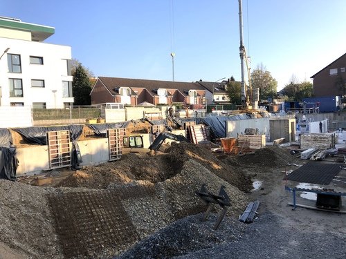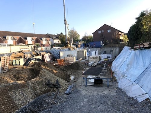Nach den Ausschachtungs- und Erdarbeiten auf dem 1.740 Quadratmeter großen Grundstück sind die ersten Wänden der Kelleretage eingezogen worden.